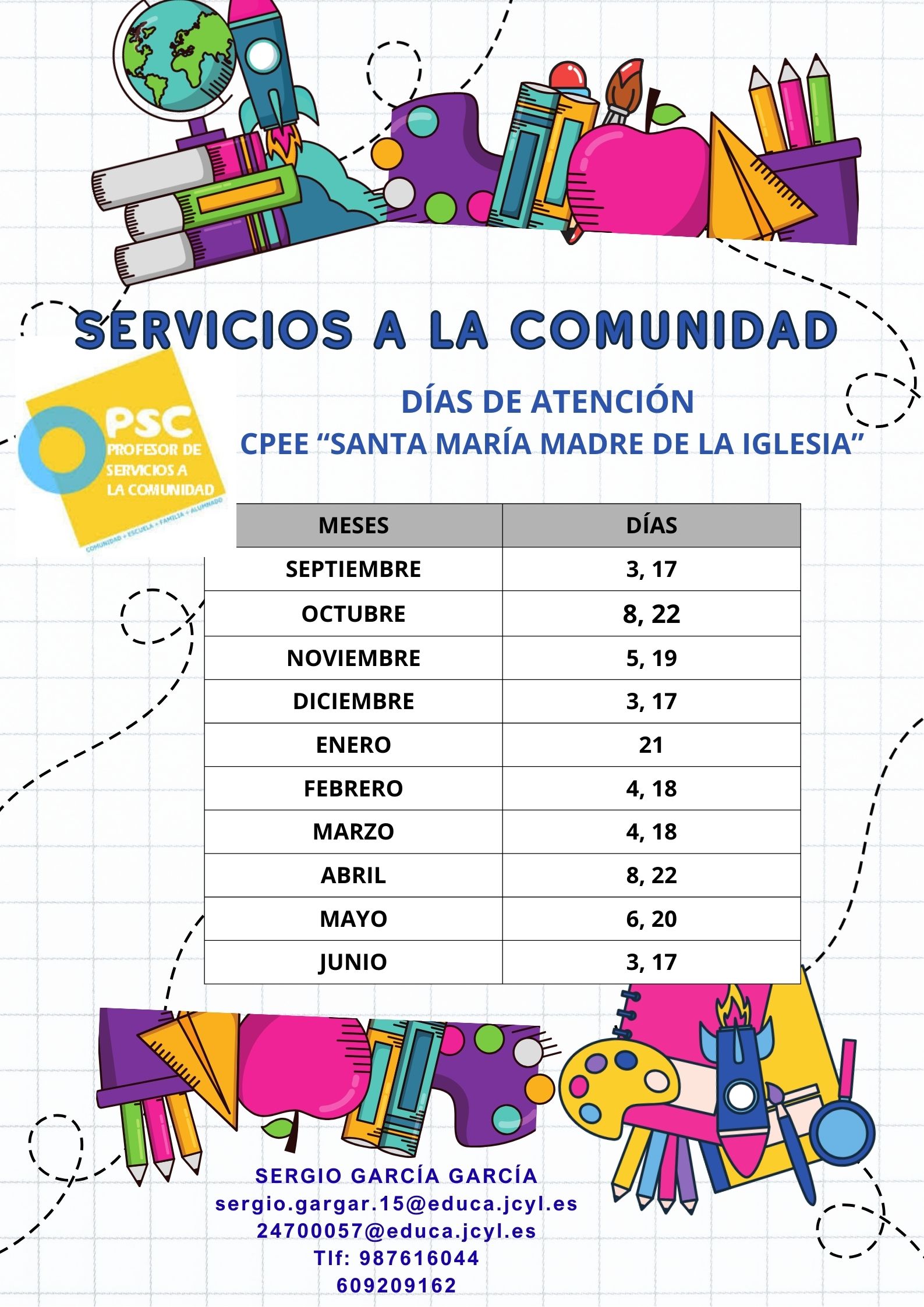 PTSC: atenderá el centro 2 sesiones mensuales: 1º y 3º miércoles del mes. Horario de atención al centro: 9:30-14:30 horas. |